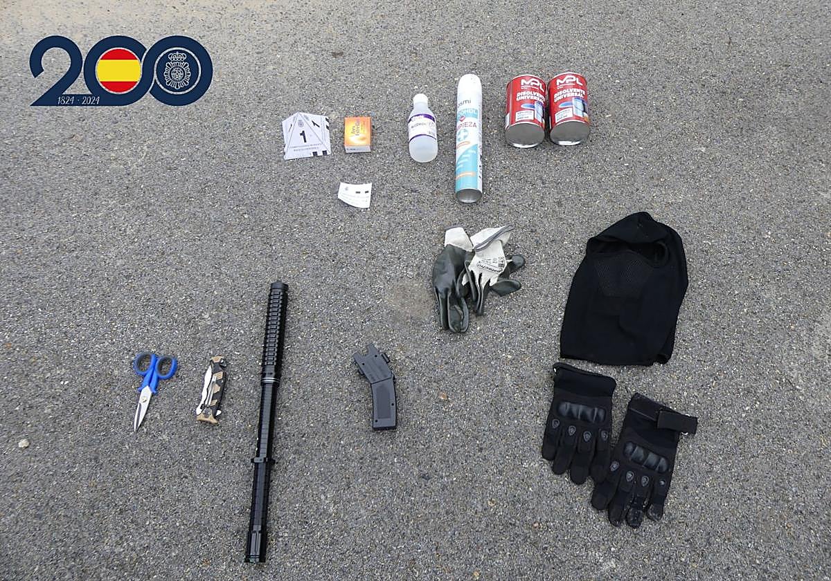 Tras su detención, los agentes hallaron en su vehículo guantes y pasamontañas para ocultar su identidad, así como sustancias inflamables como alcohol, disolvente, cerillas y otros objetos susceptibles de ser utilizados para provocar incendios, tijeras y una navaja, además de dos dispositivos de descarga eléctrica tipo táser, uno de los cuales habría sido utilizado en los hechos denunciados.