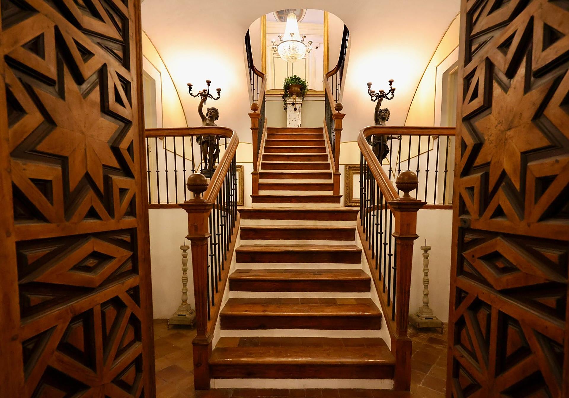 Escalera principal de acceso al edificio, con maderas nobles y decoración de época.